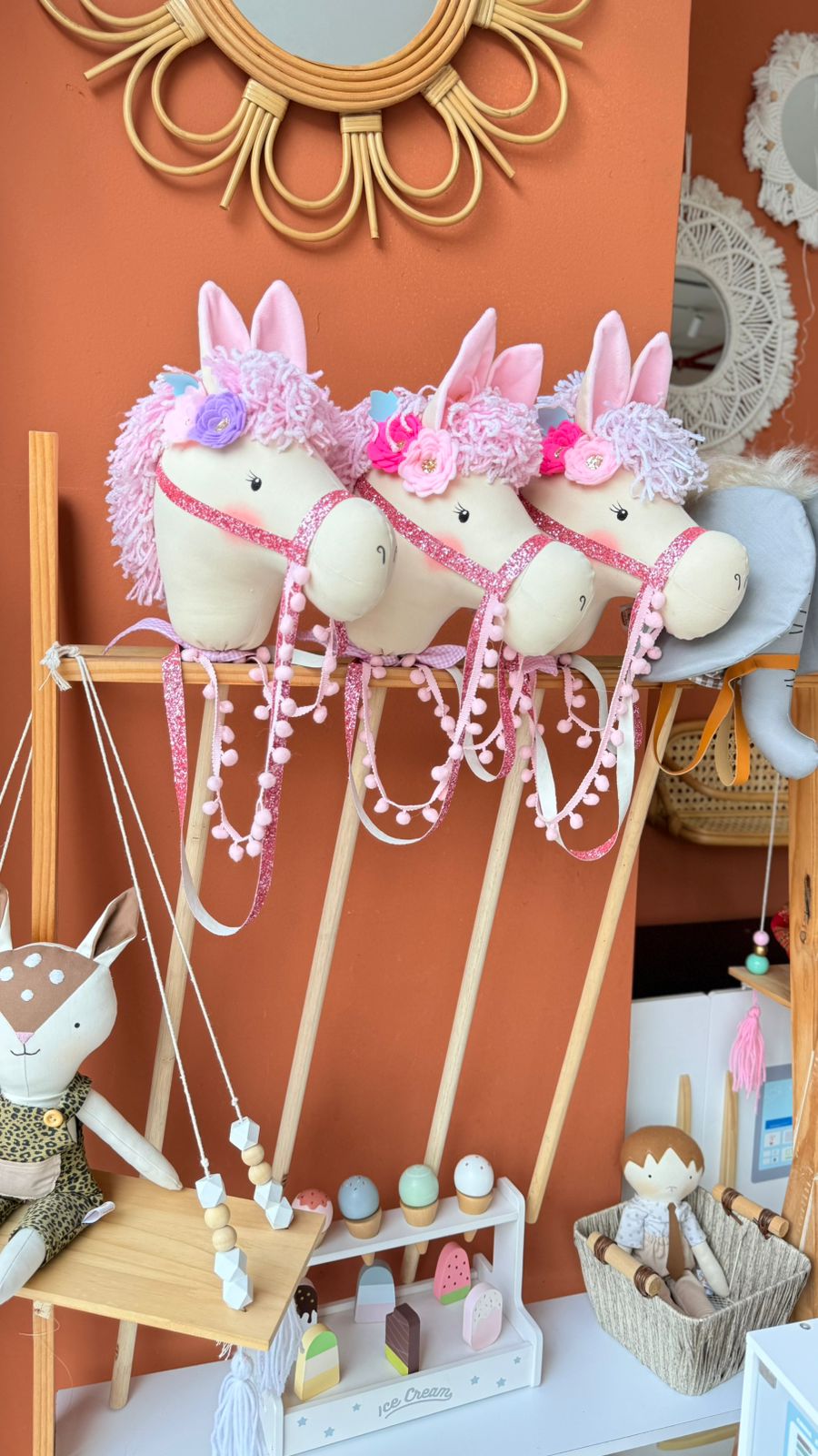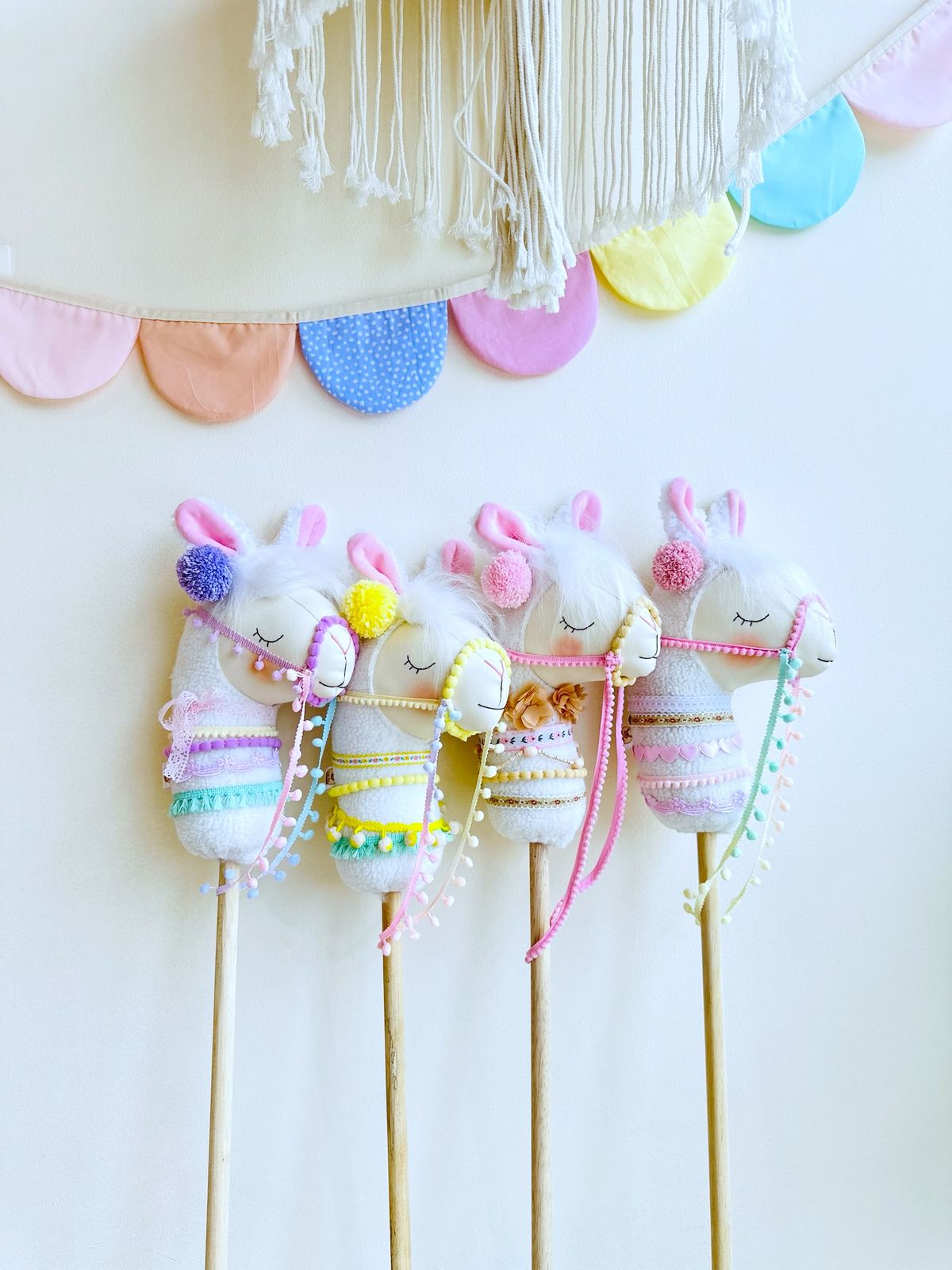 1 metro aproximadamente, cabeza de tela natural con relleno de silicona antialérgico, palo en lana, flores de fieltro y material sintéticos.
