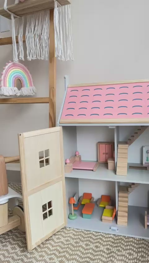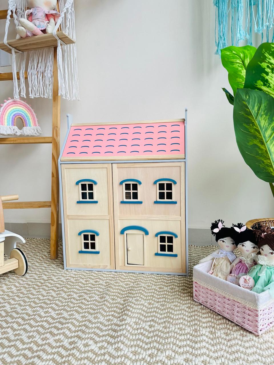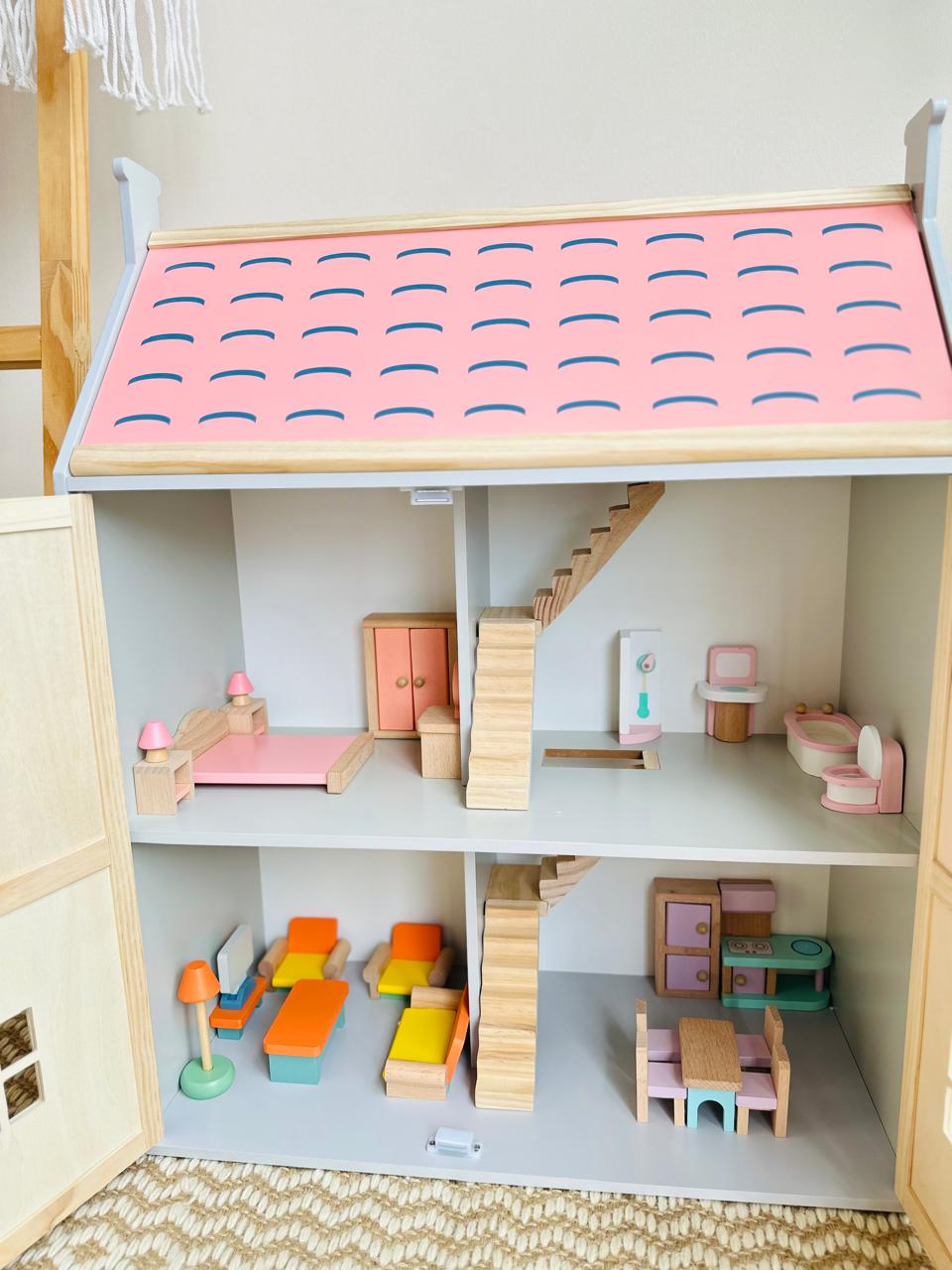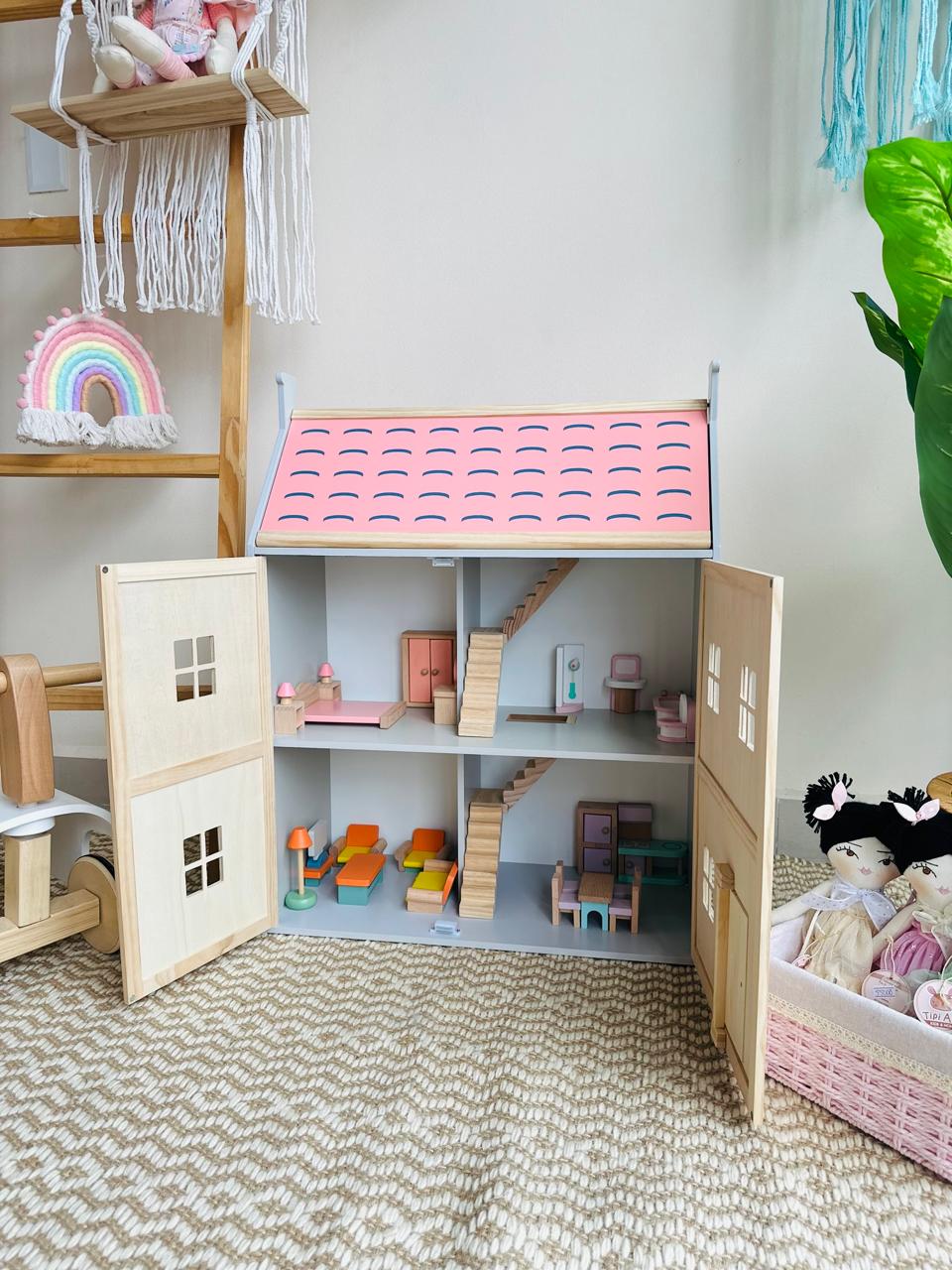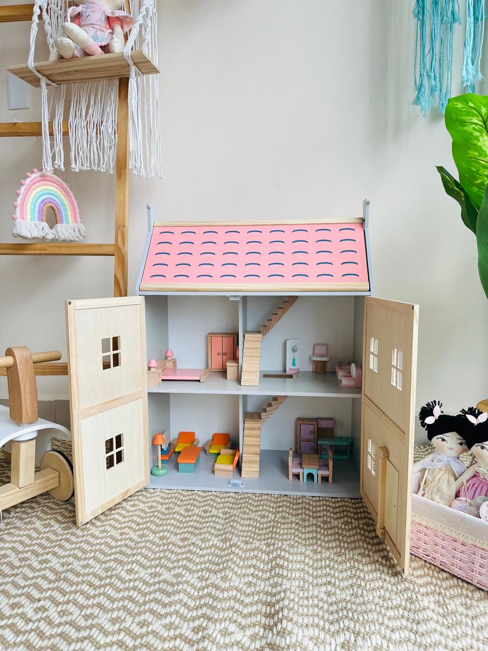 casita de muñecas rosa pastel en madera, juego didáctico incluye todos sus accesorios mide 75cm de alto por 58,5cm de ancho