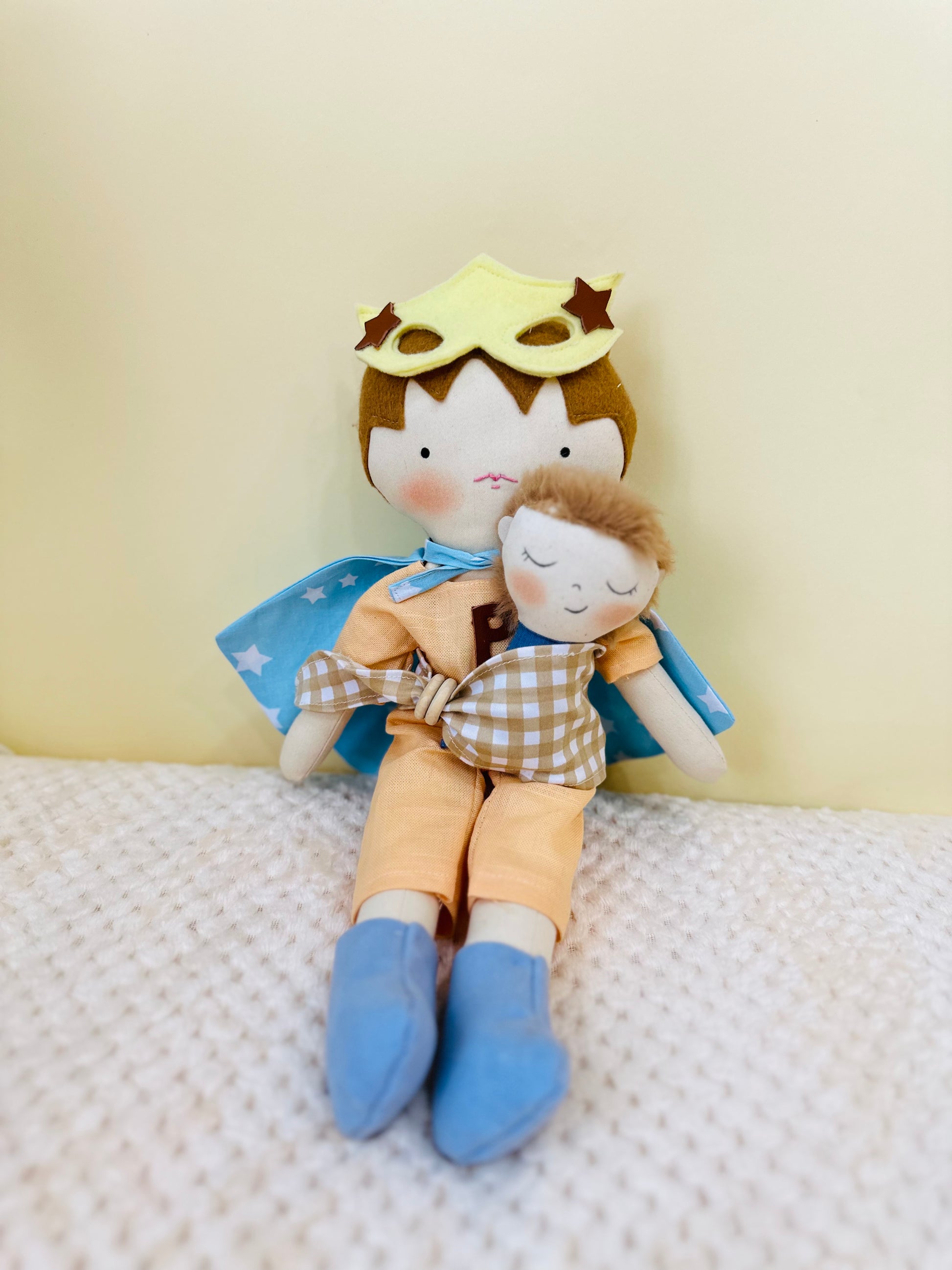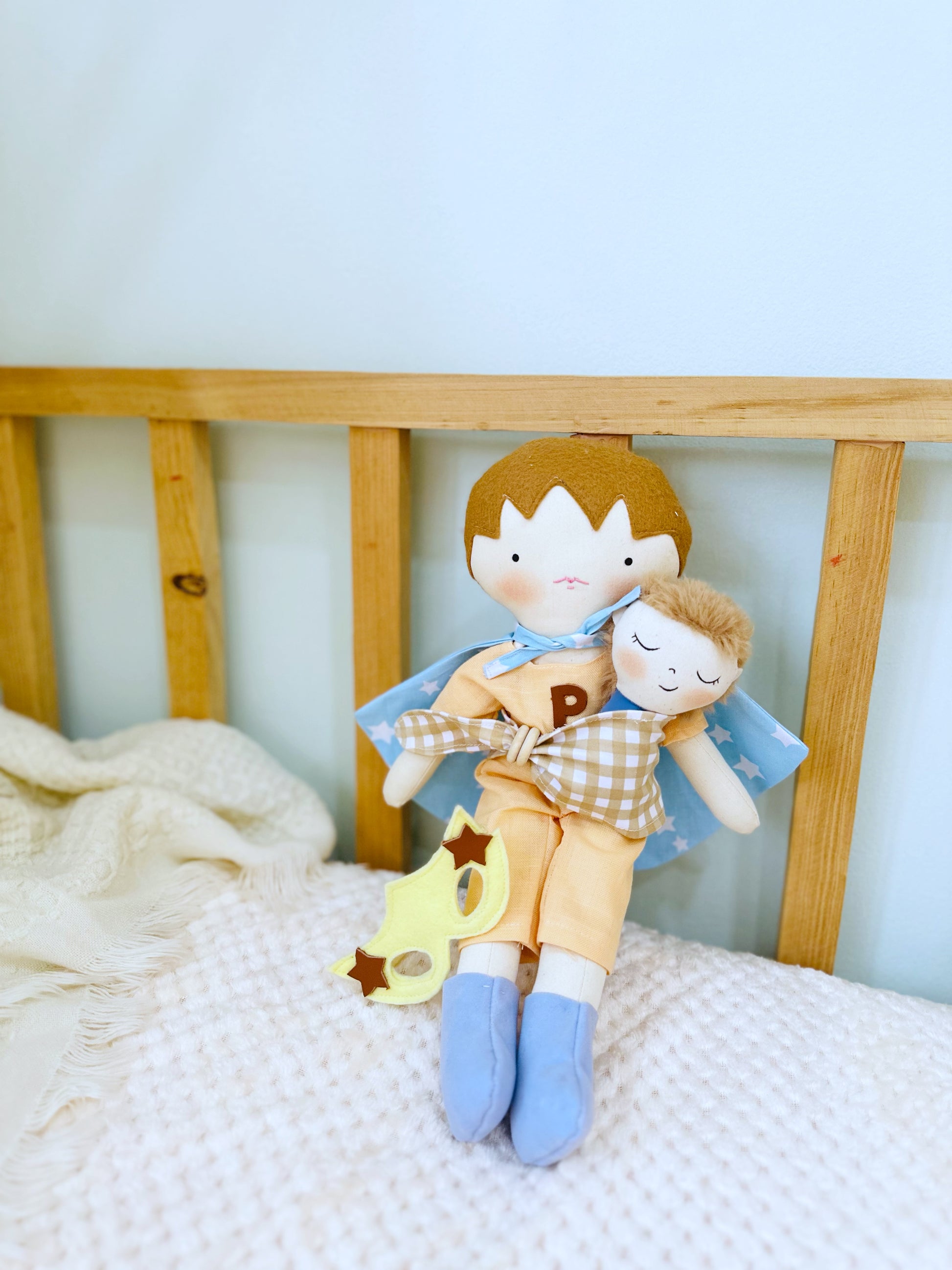 Es un super héroe de trapo, tiene variedad de colores los fabricamos con telas y estampados que tengamos disponibles en stock. su `pequeño bebe puede ser niño o niña